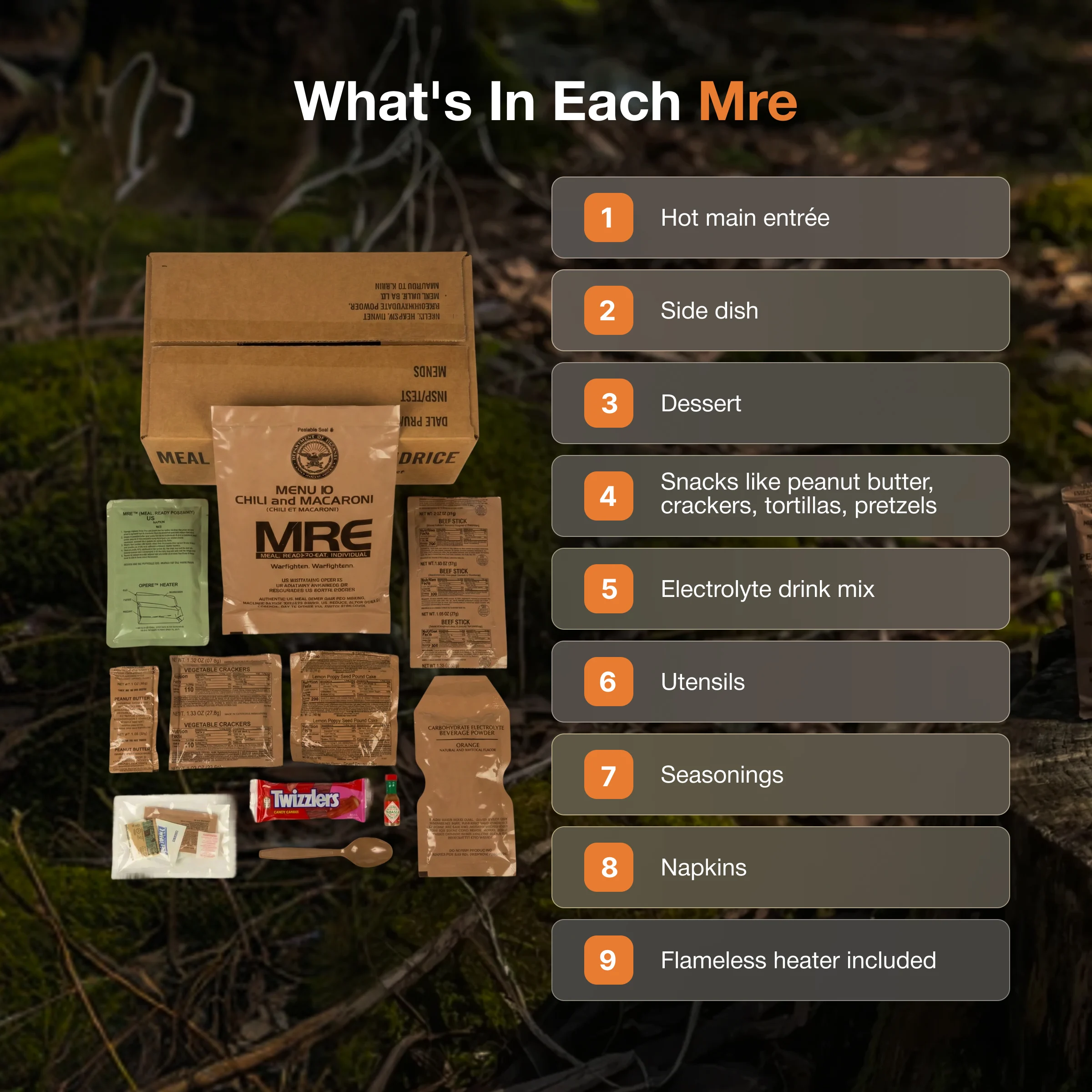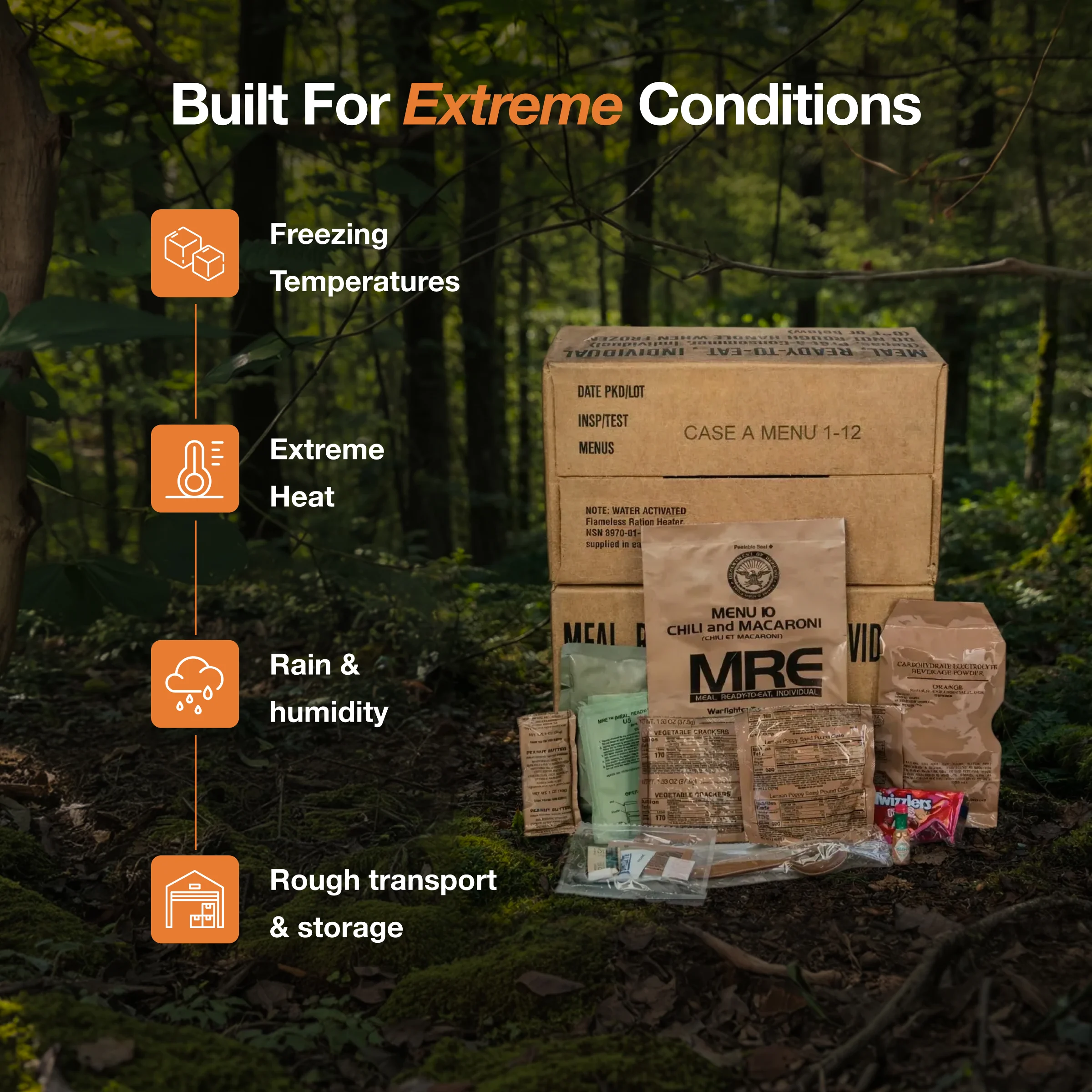 4. This makes MREs one of the only emergency foods that can give you a hot meal in total blackout situations.